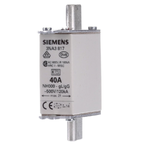 Ασφάλεια Μαχαιρωτή NH000 63A 600VAC / 250DC – Ασφάλεια χαμηλής τάσης HRC NH00 63A 3NA3822-7 – Siemens 120 kA, (gL/gG  κατάλληλη για προστασία γραμμών, προστασία συσκευών).