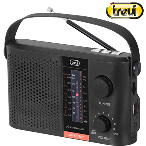 Φορητό ηλιακό ραδιόφωνο Trevi RA 7F25 με μεγάλη ευαισθησία και ακρίβεια συντονισμού. Εκτός από την ακρόαση των αγαπημένων σας σταθμών, με το φορητό ραδιόφωνο Trevi μπορείτε επίσης να παίξετε μουσική από μνήμες flash, όπως USB Sticks και MicroSD ή απευθείας από τις συσκευές σας μέσω ασύρματης σύνδεσης Bluetooth. Το ραδιοφωνάκι της Trevi RA 7F25 BT τροφοδοτείται από εσωτερική μπαταρία λιθίου, επαναφορτιζόμενη μέσω υποδοχής USB Type-C και ενσωματωμένου ηλιακού πλαισίου που βρίσκεται στο πίσω μέρος του ραδιοφώνου.